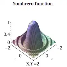 Une fonction sombrero (parfois appelée fonction besinc ou fonction jinc)[1] est l'analogue bidimensionnel en coordonnées polaires de la fonction sinc et est ainsi appelée parce qu'elle a la forme d'un sombrero. Cette fonction est fréquemment utilisée dans le traitement d'images. Elle peut être définie via la fonction de Bessel du premier type où ρ2 = x2 + y2 .