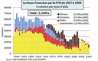 Parmi les aides du FFN, ce sont les subventions octroyées à des petites surfaces qui sont majoritaire (53%). Ainsi ce sont près de 1,9 Mha de « timbres-poste » d’une surface de 1 à 2 ha qui ont bénéficié du FFN[8], ce qui peut constituer actuellement un handicap en termes de gestion et d’exploitation. Concernant la nature des propriétaires, ce sont plus de 75% de surfaces appartenant à des propriétaires privés qui ont bénéficié des aides du FFN[14].