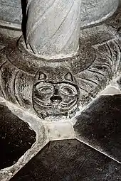La cuve carrée est portée par un pilier central orné de deux anneaux toriques et par quatre colonnes d'angle torsadées, reposant sur un socle sculpté orné de huit têtes de lion[4].
