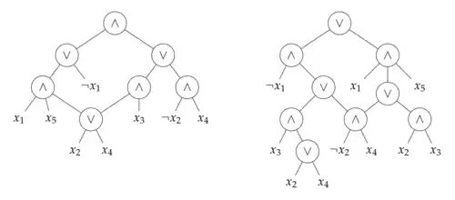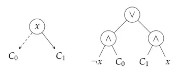 Les diagrammes de décision binaires (BDD) ont une traduction NNF naturelle. Une méthode pour l'obtenir consiste à convertir les nœuds de décision de la BDD en circuits NNF comme indiqué sur la figure. Quand on atteint les nœuds terminaux et , ceux-ci sont transformés en entrées constantes ou . Comme le graphe orienté d'une BDD est acyclique et qu'aucune porte NEG n'est introduite dans la procédure sauf sur des entrées booléennes, le circuit obtenu est sous forme NNF. Si dans le cas représenté sur la figure, n'appartient ni à ni à alors le circuit pour ce nœud de décision est une DNNF.
