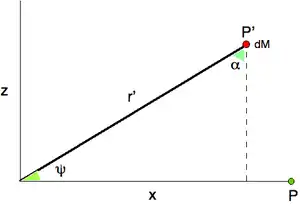 En faisant l'hypothèse que le corps est de révolution autour de l'axe Oz, c'est-à-dire qu'il possède une symétrie axiale d'axe Oz, on a . Désignons par l'angle que fait la direction OP avec le plan Oxy[note 6]. Alors et, à cause de la relation liant les cosinus directeurs, on trouve
