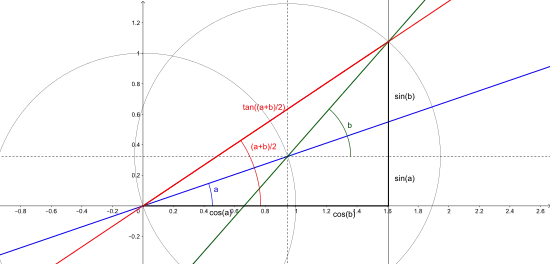 Géométriquement, la construction suit le cheminement suivant : pour un point (cos φ, sin φ) du cercle unité, on trace la ligne passant entre ce point et le point de coordonnées (−1, 0). Cette droite intersecte l'axe y en un point d'ordonnée y = t. On peut voir par une étude géométrique simple que t = tan(φ/2). L'équation de la ligne tracée est donc y = (1 + x)t. L'équation de l'intersection de la ligne et du cercle devient une équation quadratique en t, dont les deux solutions sont évidemment (−1, 0) et (cos φ, sin φ), mais elles peuvent donc êtres écrites comme fonctions rationnelles de t.