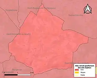 Le retrait-gonflement des sols argileux est susceptible d'engendrer des dommages importants aux bâtiments en cas d’alternance de périodes de sécheresse et de pluie. La totalité de la commune est en aléa moyen ou fort (67,4 % au niveau départemental et 48,5 % au niveau national). Sur les 105 bâtiments dénombrés sur la commune en 2019, 105 sont en aléa moyen ou fort, soit 100 %, à comparer aux 84 % au niveau départemental et 54 % au niveau national. Une cartographie de l'exposition du territoire national au retrait gonflement des sols argileux est disponible sur le site du BRGM[20],[Carte 2].