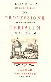 En 1797, sort la Feria Sexta in parasceve de processione ad ponendum Christum in Sepulcro, livre de musique imprimé en rouge et noir.
