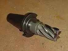 Cette fraise a un attachement par alésage, aussi est-elle montée sur un mandrin muni d'une clavette, comme la fraise 3 tailles.