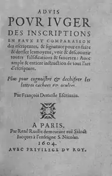 - Advis pour juger des inscriptions en faux et comparaison des escritures et signatures, plus pour cognoistre et deschiffrer les lettres cachées et occultes, Paris, René Ruelle, 1609, 32° (Paris BNF : F-25415).