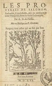 Les Proverbes de Salomon, ensemble l’Ecclesiaste, mis en cantiques & rime françoise, selon la vérité hebraïque, par Accace d’Albiac du Plessis. Mis en musique par F. Gindron. Lausanne : Jean Rivery, 1556. Numérisé sur Gallica[6].