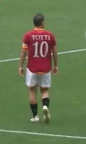 Francesco Totti, né le à Rome, est un footballeur international italien devenu dirigeant sportif. Il évoluait au poste d'attaquant ou de milieu de terrain offensif à l'AS Rome durant la totalité de sa carrière de 1993 à 2017. Champion du monde en 2006, il est reconnu pour son exceptionnelle longévité[2] et sa fidélité absolue envers son équipe de cœur, la Roma, disputant vingt-cinq saisons professionnelles au club jusqu'à plus de quarante ans[3],[4].