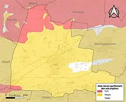 Les mouvements de terrains susceptibles de se produire sur la commune sont des tassements différentiels[22]. Le retrait-gonflement des sols argileux est susceptible d'engendrer des dommages importants aux bâtiments en cas d’alternance de périodes de sécheresse et de pluie[23]. 96,6 % de la superficie communale est en aléa moyen ou fort (54,9 % au niveau départemental et 48,5 % au niveau national)[Carte 2]. Depuis le , en application de la loi ELAN, différentes contraintes s'imposent aux vendeurs, maîtres d'ouvrages ou constructeurs de biens situés dans une zone classée en aléa moyen ou fort[Note 3],[24].