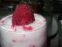 Un fruit fool est un dessert d’origine anglaise à base de purée de fruits et de crème fouettée sucrée et aromatisée, par exemple à l’eau de rose.