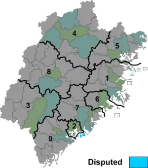 La province de Fujian est subdivisée en 9 villes-préfectures dont une Ville sous-provinciale (Xiamen).