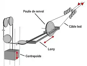 La présence d'un câble retour (câble contre-tracteur ou lest), réalisant la demi-boucle basse en gare aval, demeure accessoire. Ce dernier est cependant mis en place sur certaines installations, notamment quand la pente est faible ou que la ligne possède des changements d'inclinaison prononcés. En gare aval, la poulie de renvoi de ce câble lest est montée sur un lorry maintenu dynamiquement en tension par un contrepoids ou par un vérin hydraulique[2]. Le câble lest garantit alors une tension constante du câble tracteur. Il évite l’effet rebond et empêche tout phénomène de fouet, assurant ainsi un entraînement sans à-coups, et une circulation douce et confortable des véhicules.
