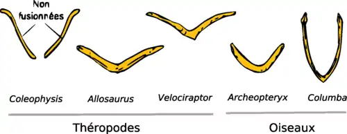 On sait donc aujourd'hui que ce caractère est partagé aussi par certains dinosaures théropodes (Allosaurus et Velociraptor). Chez ces derniers et l'oiseau fossile Archeopteryx, il a une forme de boomerang. Chez les oiseaux actuels il a pris une forme en V plus marquée.