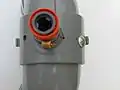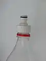 La partie mâle est adaptée au goulot de la bouteille de manière étanche et devient la tuyère. Le plus facile, pour ce faire, est de percer le bouchon de la bouteille pour y insérer le raccord mâle réduit par limage[n 6]. Un tuyau de cinq mètres est fixé au raccord femelle et fermé à son extrémité par une valve de vélo qui permet de brancher la pompe et de conserver la pression.