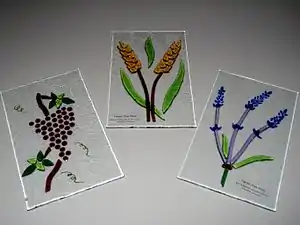 Poser dessus des morceaux de verre : en plaque, concassés, fritte, fils, de différentes couleurs en fonction du motif souhaité. Les verres doivent être testés compatibles entre eux.