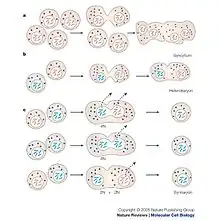 Dans la cellule hybride, les noyaux donneurs peuvent rester séparés ou peuvent se fusionner, mais durant les divisions cellulaires ultérieures, un seul fuseau mitotique se forme de sorte que chacune des cellules filles aura un seul noyau contenant des jeux de chromosomes, complets ou partiels, de chaque lignée parentale.