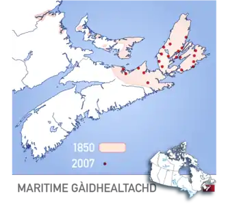 Le gaélique écossais a subsisté parmi les communautés descendues des immigrants écossais arrivés à l'époque des Highland Clearances. Ceux-ci se trouvent aujourd'hui dans l'est du Canada, en Nouvelle-Écosse (en particulier à l'Île du Cap-Breton), à l'Île-du-Prince-Édouard et Terre-Neuve-et-Labrador. Ces régions où est parlé le gaélique peuvent également être appelées Gàidhealtachdan.