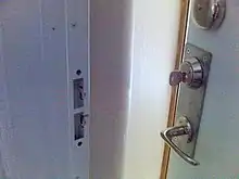 - Gâche carrée et à bascule - Gâche encloisonnée, qui porte à l'intérieur des repères pour des verrous[S 1].