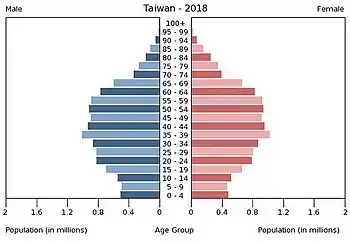 Selon le Conseil national de développement de Taïwan (NDC), la population du pays pourrait commencer à diminuer d'ici 2022 et le nombre de personnes en âge de travailler pourrait chuter de 10 % d'ici 2027. Environ la moitié des Taïwanais seraient âgés de 50 ans ou plus en 2034[43]. Selon le NDC, Taïwan a atteint le stade de société vieillissante - où le nombre de personnes âgées de 65 ans et plus est d'environ 7 % - en 1993. Comme la Corée du Sud, Taïwan est depuis passé du stade de société vieillissante à celui de société âgée, où le nombre de personnes âgées dépasse 14% de la population totale. Il a donc fallu 25 ans au pays pour effectuer cette transition démographique, contre 17 ans en Corée du Sud. Au cours des années 2010, le taux de fécondité de Taïwan a oscillé juste au-dessus de 1,0, ce qui en fait l'un des plus bas du monde[44],[45]. En fait, les données du ministère de l'intérieur montrent que le taux de fécondité est constamment inférieur à 1,5 depuis 2001[45]. (En 2010, le taux de fécondité de Taïwan est en fait passé sous la barre des 1,0 parce que l'on pensait que c'était une mauvaise année pour avoir des enfants, l'année précédente ayant été considérée comme peu propice au mariage[46].) De nombreux couples vivent encore chez leurs parents, et l'ancienne génération attend des femmes qu'elles restent à la maison, s'occupent des enfants et des tâches ménagères[46]. Les allocations et les subventions du gouvernement n'ont pas réussi à encourager davantage de personnes à se reproduire[46], mais le gouvernement a ajouté plus d'argent pour la garde d'enfants, l'éducation et les allocations de naissance[47]. Le gouvernement envisage également des politiques d'immigration visant à attirer des travailleurs hautement qualifiés d'autres pays[45], et de faire de l'anglais une langue officielle[47].