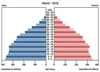 2018 a été la première année où le nombre de personnes âgées de plus de 65 ans (705 millions) a dépassé celui des personnes âgées de zéro à quatre ans (680 millions). Si les tendances actuelles se poursuivent, le rapport entre ces deux groupes d'âge dépassera deux d'ici 2050[13]. Les taux de fécondité ont baissé dans le monde entier en raison de l'élévation du niveau de vie, d'un meilleur accès aux contraceptifs et de l'augmentation des opportunités éducatives et économiques. En fait, environ la moitié des pays avaient une dénatalité au milieu des années 2010. Le taux de fécondité moyen mondial était de 4,7 en 1950, mais il est tombé à 2,4 en 2017. Toutefois, cette moyenne masque les énormes variations entre les pays. Le Niger a le taux de fécondité le plus élevé du monde, avec 7,1, tandis que Chypre a l'un des taux les plus bas, avec 1,0. En général, les pays les plus développés, dont une grande partie de l'Europe, les États-Unis, la Corée du Sud et l'Australie, ont tendance à avoir des taux de fécondité plus faibles[14]. Les habitants de ces endroits ont tendance à avoir des enfants plus tard et à en avoir moins[13]. Cependant, des enquêtes menées dans les économies développées suggèrent que la taille souhaitée des familles par les femmes est généralement plus élevée que leur fécondité effective. La stagnation des salaires et l'érosion des programmes d'aide sociale en sont les facteurs. Si certains pays, comme la Suède et Singapour, ont essayé diverses mesures incitatives pour augmenter leur taux de fécondité, ces politiques n'ont pas été particulièrement efficaces. De plus, les taux de natalité après la pandémie mondiale de COVID-19 pourraient chuter de manière significative en raison de la récession économique[15]. En fait, les données de la fin de l'année 2020 et du début de l'année 2021 suggèrent que, malgré les attentes de certains d'un baby-boom dû aux lockdowns, c'est précisément le contraire qui s'est produit, du moins dans les pays développés comme la France ou les États-Unis, mais pas nécessairement dans les pays en développement, comme le Brésil ou l'Ouganda[16],[17],[18].