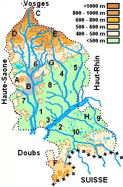 À ces torrents vosgiens il faut ajouter l'Allaine (rep. 10) et ses affluents la Coevatte et la Vendline, tous trois descendant de Suisse et la Suarcine (rep. 9). Après avoir recueilli la Bourbeuse l'Allaine change de nom pour s'appeler l'Allan. Plus loin dans sa course, elle reçoit la Savoureuse et se jette dans le Doubs vers Voujeaucourt.