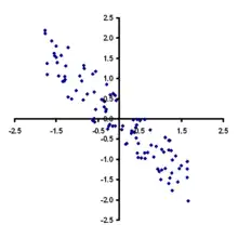 - elle mesure les corrélations entre les différentes questions. La figure illustre ici deux critères, chacun représenté par un axe. Pour cet exemple, en première analyse, quand le critère de l'axe horizontal prend des valeurs de plus en plus élevées, alors le critère de l'axe vertical prend des valeurs de plus en plus basses. Les deux critères sont dits anticorrélés.