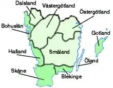Il comprend les provinces historiques (landskap) : Småland, Öland, Västergötland, Östergötland, Dalsland (en clair sur la carte ci-contre) et depuis le XVIIe siècle Bohuslän, Halland, Scanie (Skåne), Blekinge et Gotland (en sombre sur la carte ci-contre). Au début du Moyen Âge (qui commence en Suède vers l'an 1000), le Värmland et peut-être aussi le Närke, aujourd'hui provinces du Svealand, étaient également considérés comme götalandais.
