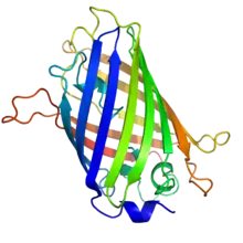 La GFP a été décrite pour la première fois en 1962. Elle est constituée de 238 acides aminés pour une masse moléculaire d'environ 27 kDa. Le chromophore (centre actif responsable de la fluorescence) est constitué par les chaînes latérales d'une glycine, une tyrosine et une sérine.