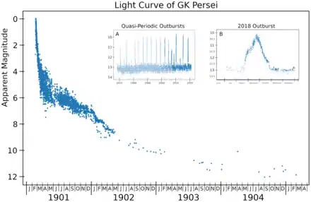 À la suite de l'événement de 1901, GK Persei est tombé entre les magnitudes 12,5 et 13,5 dans la première partie du XXe siècle, ne montrant plus d'activité significative. Mais à partir de 1966, le système binaire a commencé à entrer en éruption et s'est mis à présenter explicitement les caractéristiques des naines blanches cataclysmiques. L'augmentation de luminosité, atteignant trois magnitudes, est depuis constatée quasi-périodiquement avec un intervalle de trois ans[6].