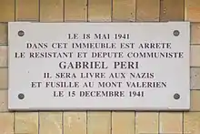 Gabriel Péri, né le à Toulon et mort pour la France[1] le au Mont-Valérien (Suresnes), est un journaliste et homme politique français. Membre du Comité central du Parti communiste français, responsable du service de politique étrangère de L'Humanité et député de Seine-et-Oise, il fut arrêté comme résistant par la police française et fusillé comme otage par les Allemands au fort du Mont-Valérien.
