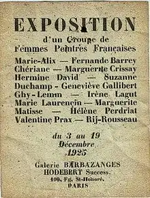 - 3 - 19 décembre : Exposition d'un Groupe de femmes peintres françaises : Alice Marie-Alix, Fernande Barrey, Chériane, Marguerite Crissay, Hermine David, Suzanne Duchamp, Geneviève Gallibert, Marguerite Ghy-Lemm, Irène Lagut, Marie Laurencin, Jacqueline Marval, Marguerite Matisse, Hélène Perdriat, Valentine Prax et Jeanne Rij-Rousseau[54].