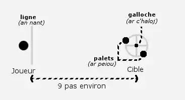 - La galoche, appelée kaloj ou kalochenn (ar c'haloj, ou ar galochenn en breton) est un petit cylindre de bois, d'environ 11,5 cm de haut pour 3,5 cm de diamètre, ce diamètre étant légèrement rétréci à mi-hauteur. Le bois dur est conseillé, pour résister aux chocs avec les palets.