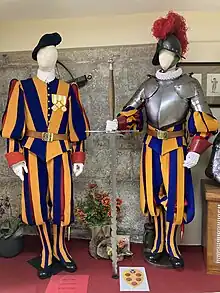 L'uniforme de gala (en) a varié au cours des siècles[16]. Actuellement, il s'agit d'un pourpoint façonné en pointe, orné jusqu'aux guêtres d'un motif rayé à larges bandes rouges, jaunes et bleues (le bleu et le jaune sont les couleurs de la famille Della Rovere à laquelle appartenait Jules II, le rouge a été ajouté par son successeur Léon X, un Médicis). Il n'a pas été dessiné par Michel-Ange pendant la Renaissance comme le veut la légende, mais est l'œuvre de Jules Repond (1853 - 1933), commandant de la Garde de 1910 à 1921, qui s'inspira en 1914 des fresques de Raphaël. Le motif alterne un bleu nuit avec un jaune canard, d'où émerge le rouge sang du sous-vêtement. Les pantalons sont bouffants, l'uniforme est surmonté d'une collerette blanche à soufflets[17]. Les uniformes sont créés sur mesure et bénis par le pape pour chaque garde. Quand l'un d'eux finit son service, son uniforme doit être détruit au hachoir afin d'éviter toute utilisation frauduleuse ou abusive[18]. Seuls les hallebardiers, les vice-caporaux et les caporaux portent cet uniforme très voyant, les sous-officiers supérieurs (sergents et sergent-major) portent un pantalon cramoisi et un pourpoint noir, tandis que l'uniforme des officiers est entièrement cramoisi.
