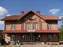 La gare, mise en servie en 1888 et fermée depuis 1971, dispose d'un bâtiment principale historique protégé (Byggnadsminne).