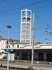 La gare ressemble à une locomotive à vapeur, grâce à sa tour haute de 23 mètres pouvant représenter la cheminée[7], les porches, les roues, et le bâtiment des voyageurs, le poste de commande[10]. Tout en haut de cette tour de section carrée, une horloge à quatre cadrans est installée[7]. La toiture des différents volumes est de forme arrondie, avec des pavés de verre au plafond de la salle des pas perdus.