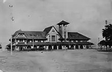 En regardant l'édifice du côté sud, la partie droite de la façade semblait ainsi un peu tronquée, rendant ce décrochage peu esthétique. Le bâtiment a subi des travaux d'agrandissement dans sa partie nord-est entre 1943 et 1949 : la toiture a été rallongée, couvrant la petite terrasse, le fronton portant le nom de la ville a disparu, ainsi que les motifs imitant les pans de bois. Ces modifications, quoiqu'on en ignore la raison, ont un peu rétabli l'équilibre de la façade par rapport au volumineux pavillon situé au sud-ouest.