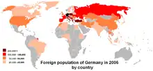 En 2013, on estimait que 20,5 % de la population était d'origine étrangère, soit 16,5 millions de personnes, 9,7 millions de nationalité allemande et 6,8 millions de nationalité étrangère. La ville-état de Hambourg affiche le plus fort taux de population d'origine immigrée avec une proportion qui atteint 28,9 %. Les landers de l'ex RDA ont une population étrangère beaucoup plus faible avec seulement 3,4 % des étrangers qui sont recensés sur cette partie du territoire, et concentré à 97 % dans la capitale Berlin. Pour les Allemands d'origine étrangère, si on prend en compte leur nationalité d'origine ou celle de leurs parents, 13 % sont d'origine turque, 11 % polonais, et 9 % russe[46].
