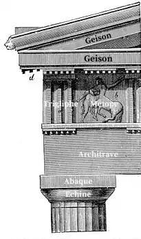 Cet élément d'architecture grecque, appelé aussi larmier, protège de l'atteinte directe des intempéries.