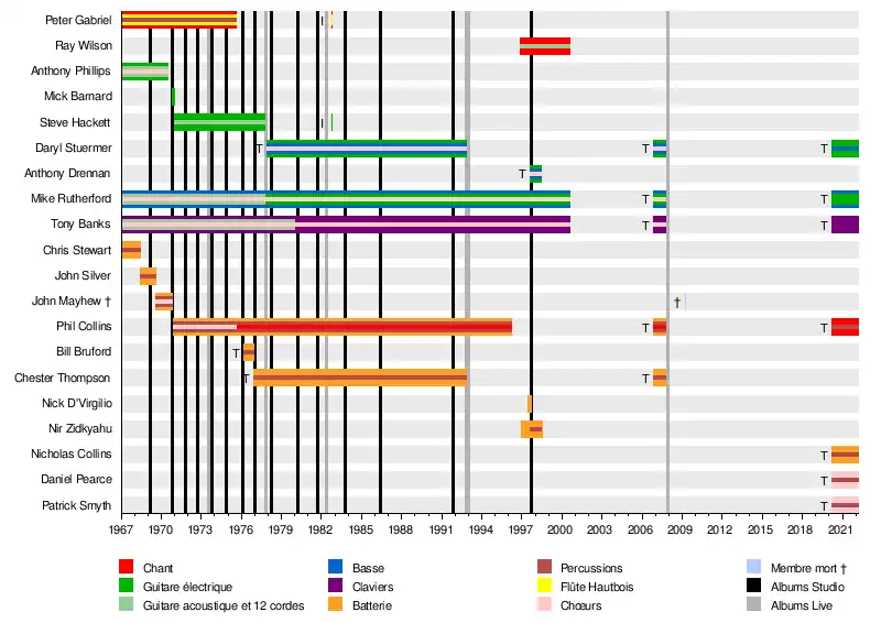 - Tony Banks - claviers (1967-1999, 2006-2007, 2020-2022), guitare acoustique 12 cordes (1967-1980), chœurs (1967-1999, 2006-2007), vocodeur (1980-1999)