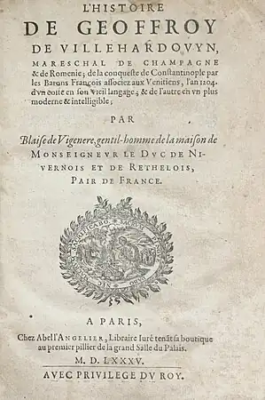 - Histoire de Geoffroy de Villehardouyn, Mareschal de Champagne & de Romenie; de la conqueste de Constantinople par les Barons François associez aux Venitiens, l'an 1204, Abel L'Angelier, 1585. Lire en ligne sur Overnia.