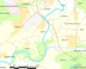 Gevry se situe dans la plaine doloise, avant les premiers plateaux jurassiens.