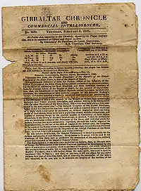 Le Gibraltar Chronicle est né en relation directe avec la garnison anglaise dans la colonie et publié sur un panneau d'affichage dans la Bibliothèque de la Garnison de Gibraltar. Il a été rapidement décidé que les informations devraient être mises à la disposition du public. Un bulletin a été imprimé à la Bibliothèque de la Garnison le et vendus par H. et T. Cowper, composé de quatre pages, dont trois en anglais et une en français. La nouvelle de la victoire de Nelson à Copenhague, est apparu sur la quatrième page. La deuxième édition a été imprimée le . Le premier rédacteur en chef était un Français nommé Charles Bouisson, installé à Gibraltar en 1794[1].
