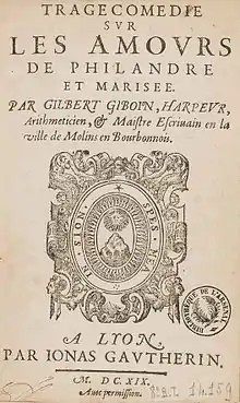 - Tragécomedie[3] sur les Amours de Philandre et Marisée. Par Gilbert Giboin, harpeur, arithmeticien, & maistre escrivain en la ville de Molins en Bourbonnois. Lyon : Jonas Gautherin, 1619. 8°, 95-[1] p. Paris Ars. : 8 BL 14159. Numérisé sur Gallica. Cf. Cioranescu t. 2 n° 32981. Œuvre dédiée à l'écrivain Honoré d'Urfé, avec dans les pièces liminaires des stances de Michel Antoine Gaigneu dédiées à l'auteur.
