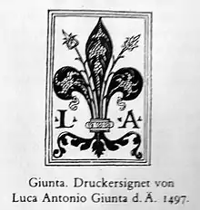 La plus ancienne imprimerie a été fondée à Venise par Bernardo et Lucantonio Giunti vers 1477[2]. Elle a été léguée en 1537 à la mort de son fondateur à la société Haeredes L. A. appartenant à Tommaso Giunti. L'imprimerie a brûlé en 1557 mais a été reconstruite avant de publier son dernier ouvrage en 1657.