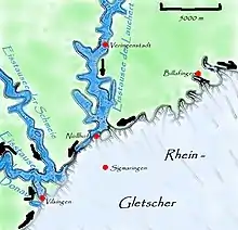 Côté suisse, le glacier du Rhin se séparait en deux langues au niveau de Sargans. La première suivait la vallée du Rhin et allait creuser le lac de Constance tandis que l'autre obliquait vers l'ouest pour aller rejoindre le glacier de la Linth en s'écoulant par-dessus les lacs du Walenstadt et de Greifen et finir dans la vallée de la Glatt. La vallée parallèle du lac de Zurich a été formée par les glaces de la Linth[2]. Les glaces s’étendaient jusqu'à Schaffhouse et Bülach.
