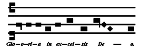 Parmi ces hymnes dans le graduel romain, le Gloria VIII (début de sa notation au-dessus) est certes fréquemment exécuté le dimanche, avec une dénomination De Angelis. Il s'agit cependant d'une mélodie tardive, fixée au XVIe siècle[ll 3]. C'est la raison pour laquelle cette version néo-grégorienne possède une couleur contemporaine :