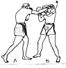 - Lors d’une attaque adverse en en anglais, « cross » à la face, [B] porte une attaque simultanée en coup de poing direct du bras avant (en anglais, « jab ») au corps
