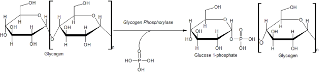(en) Clivage du glycogène par la glycogène phosphorylase libérant une molécule de glucose-1-phosphate.