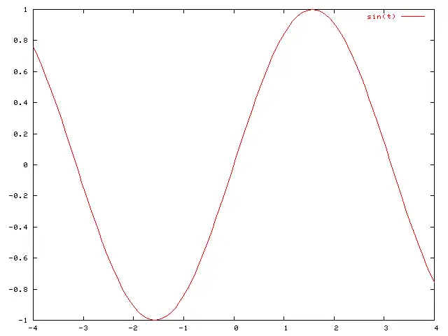 gnuplot> set terminal png Terminal type set to 'png' Options are ' small color' gnuplot> set output "exemple1.png" gnuplot> plot [t=-4:4] sin(t)