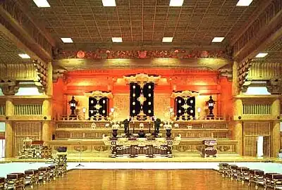 Le Gohonzon de Nichiren est l'objet de culte de l'Enseignement essentiel de ces Trois Grandes Lois « sacrées et révélées »[10] dans le Sûtra du Lotus. L'enseignement essentiel désigne la Grande Loi de Myōhō-renge-kyō sous-entendue dans les chapitres Hōben, « Moyens Opportuns » (le 2e) et Nyorai Juryō, « La Durée de la vie de l'Ainsi-Venu » (le 16e) du Sûtra du Lotus. Inscrits dans l'esprit de ce sûtra, la pratique et l´enseignement de Nichiren se fondent sur les Trois Grandes Lois sacrées et révélées : 1) la récitation avec foi de Nam-myoho-renge-kyo, à la fois le Daimoku (titre) du Sûtra du Lotus et le nom de la Loi correcte à l'époque de la Fin de la Loi qui a été transmise par Shakyamuni (Honmon no Daimoku); 2) le Gohonzon[11] en tant qu'objet de culte qui concrétise la Loi (Honmon no honzon) et 3) le lieu où il est enchâssé (Honmon no Kaidan) et où on récite le daimoku — Nam Myoho Rengue Kyo[10]. Dans la tradition bouddhiste des « trois sortes d’étude », il correspond aux Préceptes[10].